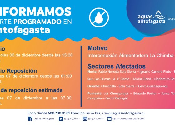 Aguas Antofagasta Informa Corte Programado en Sector Acotado del Norte Alto de Antofagasta