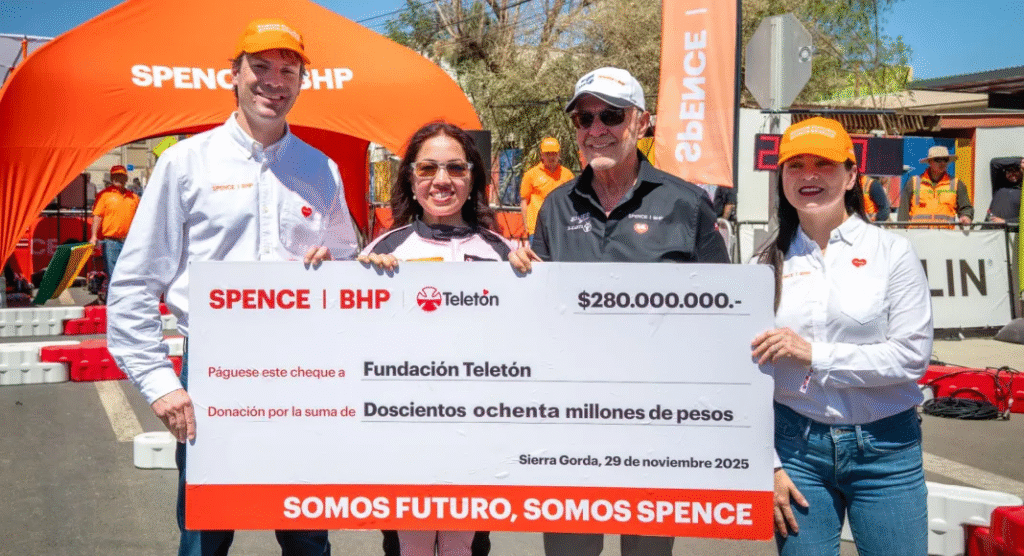 La jornada solidaria culminó con la entrega de la donación de $280 millones de pesos por parte de Spence | BHP a la Teletón. Este momento fue transmitido en vivo desde Sierra Gorda hasta el Teatro Teletón, destacando el importante compromiso regional con la campaña nacional.